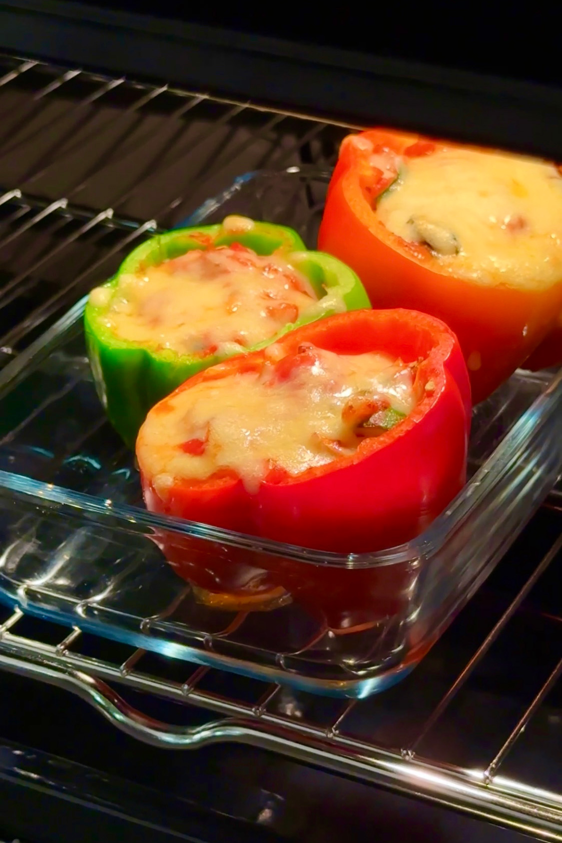 Take out peppers from the oven, layer the tomato veggie sauce with cheese until the pepper is full, top with a layer of cheese and cook in the oven until the cheese on top has colour. Serve hot and enjoy!